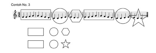 Pola dari C dan D hampir sama, keduanya descending stepwise (turun satu nada) dan nada kedua diulang atau dimainkan dua kali. Perbedaannya hanya Pola C dimulai dengan nada E dan pola D dimulai dengan nada D. Proses pembelajaran ini terlihat sangat mudah untuk kita para guru, tetapi tidak semua murid memahaminya. Karena itu, kita perlu mendidik dan mengajari murid kita untuk memahami proses ini. Dari pengalaman mengajar saya, murid-murid yang sangat muda tidak terlalu merespon label A, B, C, D. Beberapa murid saya lebih merespon dengan bentuk-bentuk (shape). Lihat contoh di bawah ini: